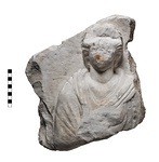 Description:   Top of head to right elbow plus smoothed background on upper left and more on her right are preserved. Top of head to mouth battered off.