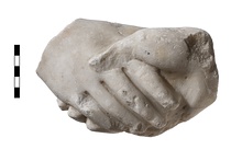 | Description: | Two clasped right hands, slightly larger than life-size, broken at wrists and behind lower and slightly larger hand (where once attached to relief). Larger hand minimally carved with fingers stub-like and little finger barely included; thumb broken. Smaller hand more carefully defined, smooth finish. Pentelic marble. | |