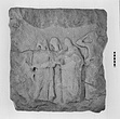 | Description: | Broken at right. Top, bottom and left sides irregularly preserved. Back originally rough-picked but smoothed from reuse. Original relief ground chipped away on edges, particularly at top. Preserved are the silhouettes of three standing females and at right a standing male (?) with his right hand on his head. At left a rough area, perhaps a rock or another figure. Molding on the left side suggests that antae and perhaps a cornice framed the relief. The women form a compact group and wear chitons and himations, which they have pulled over their heads. The male figure is slightly larger than the females - perhaps he is Apollo and the women Muses or Nymphs. The surface is very battered. Pentelic marble. | |