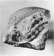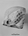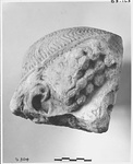 | Description: | Part of top and right side of head, ear and hair preserved. The hair is schematized in wavy lines on top and bound with a plain round fillet. Round the face it is finished with four rows of small tight curls. Archaistic. Pentelic marble. | |