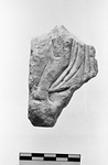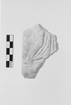 Right leg of a draped figure facing right. Fold of his mantle along the right side.