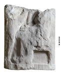 | Description: | Broken off at the top, at the shoulders of both figures; back and bottom rough-picked; sides fine-picked. Surface very much worn. The figure to the right, seated on a stool, faces left, her left hand resting in her lap, holding what seems to be drapery, her right hand upraised. The second figure, facing her, grasps some large object, around which drapery seems to be wrapped, in her outstretched left hand. Pentelic marble. | |