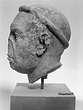 The man is distinctly middle aged, with deep lines about the eyes and from the nose to the chin, and three wrinkles across the forehead. He wears a skullcap, the end of which forms a large roll around his head. A wavy line over either temple may represent the edge of his hair or may be an attempt to show realistically the veins of a middle aged person.
