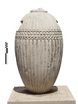 | Description: | Broken at the top and probably below. There are two cuttings for separately made handles, now missing, on opposite sides of the shoulder just above the guilloche band and at right angles to the back handle. The handle is decorated with the relief of a kantharos leaf. The missing neck rose from a disc-shaped attachment ring decorated with a scallop pattern around its perimeter. The lower body and shoulder are decorated with tongues separated by ridges and divided by a guilloche encircling the body at its widest point. Fine grained white marble with mica. | |