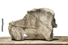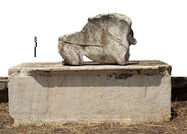 | Description: | Head, legs, and tail broken away. A griffin stands with the wing on the proper right side folded along the flank. The proper left wing is erect with undivided feathers carved. The lines of the snaky neck are preserved on the base of the neck that remains. Haunches lean and muscular. Fine grained white marble with mica. | |