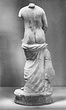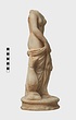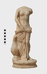The woman's weight is on her right leg, so that her body has a pronounced curve to the right. The upper part of her body is nude. She holds her drapery (with her right hand) so arranged that the rolled fold below her thighs falls between her knees straight to the ground. Four vertical locks of hair lie on the back of her neck. At her right a dolphin posed on its head served as a strut. It is cut all of a piece with her drapery. A strut still remains as well below the right elbow of the Aphrodite. The base is approximately Ionic: the torus at the top projects too far for perfect proportion.