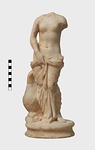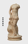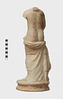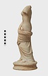 Description:   Broken into two pieces, now joined. Missing: head, left arm except for the tip of the hand, fragment of left knee below the joining point, small chips from upper torus of base.
