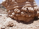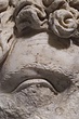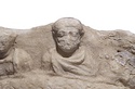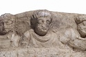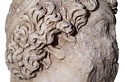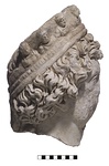 | Description: | Broken off at neck, missing most of chin, mouth and nose. Eyes damaged, but in good condition from eyebrows up. Male head, larger than life-size, with thick curly hair and light beard. From ear to ear, elaborate diadem decorated with eight small busts in cuirass or toga, below it a wreath of small pointed leaves, and below this a fillet, all tied together at back of head. Lightly incised scraggly beard, in contrast to richly detailed hair, may suggest later reworking. Portrait of prominent Athenian? Crown of busts usually indicates priest of the imperial cult. Probable date of late second to early third century AD. (cf. Nat. Mus. no. 356; 161-180 AD). | |