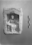 | Description: | Small relief, dimensions preserved completely, save for the central akroterion, which is broken away. Chipped; the features of the figure obliterated. Top, bottom and sides chiseled fairly smooth; back rough-picked. Female figure, Kybele, seated facing, in a small pedimental niche. She wears a high crown. Both hands are outstretched; in the right she holds a phiale. Crouching at her right side is a lion. She seems to wear chiton and himation, the latter hanging over her left arm and drawn across her knees. Crude work. Pentelic marble. | |