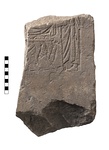 | Description: | Rectangular fragment of a relief. Broken on three sides, part of right side preserved and slightly chipped at edge. Covered in brown encrustation. Flat top surface with banquet scene incised in low relief: standing clothed figure at right by a table (two legs visible) with food on top surface. Preserved side straight and at right angle. Back heavily picked making up an irregular surface thinner towards the straight edge. White marble. | |