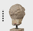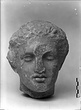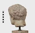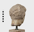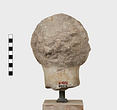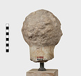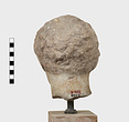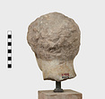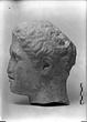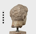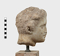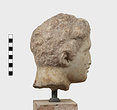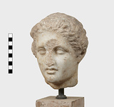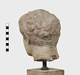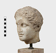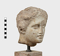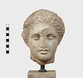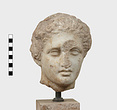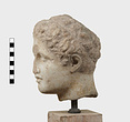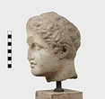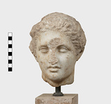 | Description: | Broken off at the neck; the nose broken, and a piece missing from the top of the head; otherwise well preserved, save for a few chips, and the remains of cement from the wall. Modern dowel hole in neck: cf. S 473. The head, slightly under life-size, is tipped slightly to the figure's right. The hair, worn in short curls brushed back from the brow, seems to have been held in place by a fillet of another material; a groove for this fillet, but no trace of metal, remains. The surface of the hair is left very rough, as if for color; the flesh is carefully polished. Although in scale and in style this head corresponds very closely to the statue S 473 (Β 571), near which it was found, there is no direct join, and the neck muscles make it seem unlikely that statue and head belong together. For a temporary union, see large photo, pl. no. 4-179. Pentelic marble. | |