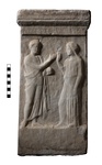 | Description: | A small grave stele with two figures facing each other in low relief. To left, a youth in a himation extends his right hand to a woman, in his left he holds a round object. The woman who faces the youth is draped; her right hand is held up in a gesture of farewell, her left hangs by her side. On the smooth molding above the heads of the figures, their names. ΛΕΑΝΔΡΟΣ ΜΝΗΣΙΣΤΡΑΤ[Η] Pentelic marble. <graphic> | |