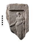 Description:   Back and right side preserved. Broken away above, below and at left. Surface worn. Standing, small, draped figure, clasping hand of another figure (lost).