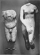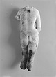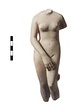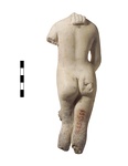 | Description: | Nude statuette with head, neck, left arm and feet missing. Metal rods for the attachment of the feet have discolored the legs. There is also a drill hole in the upper left arm for a small similar rod. On the outside of the left leg, above the knee is a small iron strut. S-curved body, with weight on right leg; right arm crossing body, left knee bent. The hair is messed at the back on four stiff locks, cut straight at the bottom. Inferior work. Knidian type. Parian marble. | |