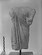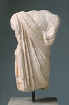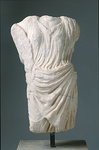| Description: | Head, arms and legs below the knees are missing. Right shoulder , breast and right side are damaged. Clad in a thin chiton, with a himation wrapped round the lower part of the body and drawn up from the back over the left shoulder. Parian marble. | |