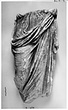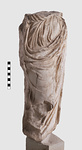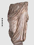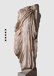 | Description: | A draped figure in high relief, preserved from waist to ankles, with part of the background. The wears a chiton girded high at her waist. Over it, around the lower part of her body, an himation, the top of which forms a heavy fold upwards to the left hip where the end was probably thrown over her left arm, and fell to the ground in heavy folds. The right leg is advanced slightly with the knee bent; the weight is on the left. Quite good cutting, but a little mechanical. Altar of Ares series. Pentelic marble. | |