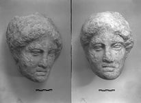 | Description: | Head of a woman, apparently from relief, broken away behind and at neck. The surface somewhat damaged. High relief, the head in three-quarters view. Features calm; hair roughly indicated. Pentelic marble. | |