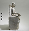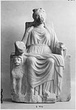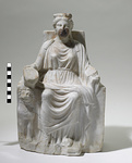 | Description: | Left hand missing, and part of right braid. The Mother sits on a throne, wearing a low polos and a girded chiton. Her cloak is carried across her lap from right to left, and hangs down beside her left leg. Her hair, parted in the middle, falls in a braid in front of each shoulder. In her right hand she holds a patera. The right support of the chair is carved in relief to represent a lion. Back of statuette left rough, head stained from contact with iron. Parian (?) marble. | |