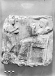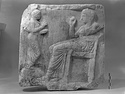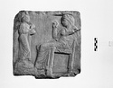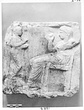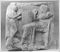 | Description: | Complete. The tongue for setting into base broken off, and the top molding battered. Draped woman seated on a chair left; with her right hand she holds her veil in front of her face. Her feet rest on a low footstool. Facing her stands a little girl, draped, holding an object in her left hand. She stands on an irregular rock; her head is at the same level as that of the seated woman. Both figures wear chiton and himation. Pentelic marble. | |