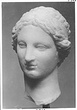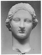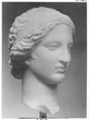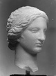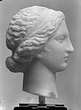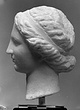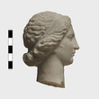 | Description: | Chip missing from back of head, smooth-finished surface at bottom of neck with hole for attachment. Head of a woman with hair parted in the center and knotted low at back, below the fillet. On each side a small lock of hair falls forward on the cheek just in front of the ear. Island (?) marble. | |