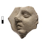 | Description: | Broken at right and above. Face of a youth, left, with a bit of hair preserved. Part of a polygonal edge of piece preserved in front of face. Back roughly picked; slightly concave. Soft yellow poros. | |