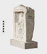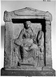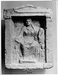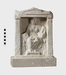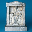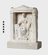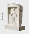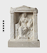 | Description: | Relief in a pedimented niche. The Mother wears a polos and is seated in a chair with a footstool; patera in right hand and tympanon in left; lion in lap. Small standing figures to her right, and to left; to left a draped woman with two long torches; to right a draped man. Pentelic marble. | |