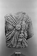 | Description: | Torso of a standing draped female figure preserved from shoulders to hips, right arm and lower left arm missing. Broken from relief. She wears a thin chiton and a heavily fringed upper garment knotted between her breasts. A garland hangs over her left shoulder and diagonally across her body. Remains of a curl hanging down over each shoulder. Pentelic marble. | |