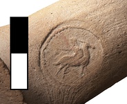 | Description: | Part of rim preserved. Circular stamp with horse and rider, right, surrounded by a beaded ring. | |