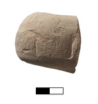 | Description: | Very small fragment; rising(?). Medium fine clay, light red, yellow near surface; cream slip. Impression incomplete at bottom; damaged at top; shorter rectangle than typical Rhodian. | |