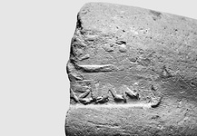 | Description: | Curve fragment of handle with distinct rib. Clay reddish-buff with large grey core. Impression incomplete above and broken away to left; thyrsos(?). | |