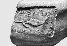 Impression broken away to left, incomplete below; right end damaged before firing; floral(?) device.