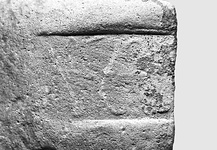 | Description: | Much worn fragment, of very broad, arched handle. Coarse micaceous clay, red with yellowish surface. Badly worn impression, its right edge broken away. | |