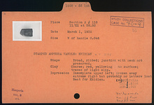 | Description: | Broad, ribbed; junction with neck not preserved. Coarse red clay, yellowing to surface; traces of light slip. Upper left part of the impression incomplete; broken away extreme right but no letters lost. Neat for Knidian. | |