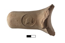 | Description: | Rising; angular. Fine reddish-yellow clay; redder at core; cream slip. Impression smeared; probably no letters missing. | |