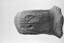 | Description: | Broad; ribbed; rises and curves down abruptly close to neck. Coarse clay, somewhat micaceous; red, greyish at core; dark wash (vestiges). Impression incomplete on right end. | |