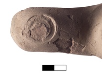 | Description: | Slightly less angular than typical. Fine clay, light red at core, yellowish near surface; cream slip. Impression much damaged. | |