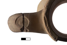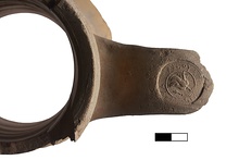| Description: | The neck and one handle nearly complete. Red stain on neck. Stamps on both handles. | |