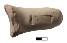 | Description: | Typical shape. Fine clay, light red at core, yellowish near surface; cream slip. Impression incomplete on top and bottom; letters barely legible. | |