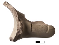 | Description: | Probably typical; large, broken before curve. Fine clay, light red; cream slip. Impression doubled; lower edge smeared; upper edge broken away. | |
