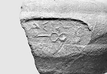| Description: | Roughly made, arched handle. Highly micaceous light red clay with large distinct slate grey core. Impression broken away to left, incomplete and worn below and to right. The only corner preserved (upper right) is rounded. Cf. SS 10266. | |