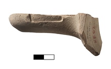 | Description: | Half preserved of an angular handle split down the middle. Buff clay. Lower line of rectangular impression preserved, pitted and worn. Given in Nilsson (1909), p. 84 (top, in list of patronymics). | |
