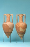| Description: | Complete neck of amphora and rim with part of shoulder, and both handles;mended largely complete, restored in plaster; no groove, rather flat topped underarm and rim for period. Capacity: (revised from wheat VG 1939 of 23.900) 24.400. Rose. | |