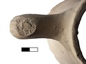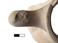 | Description: | Neck of amphora with two handles; the neck preserved to the shoulder, with all of one handle, and the upper part of the other; thickened lip, angular handles. Pinkish clay, light yellow slip. Rather small stamps (each with a rose) carelessly set close to the angle. | |