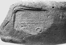 | Description: | Curve fragment. Rectangular stamp, two lines, separated by a horizontal; right side and lower edge not struck. | |