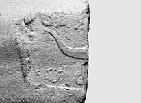 | Description: | Long curve fragment. Rectangular stamp broken at right; part of symbol at middle; line above and below; horn; inverted. | |