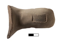 | Description: | Typical rising shape, arched. Fine clay, light red, yellow near surface; pinkish cream slip. Impression set with a curve; incomplete at top. | |
