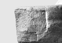 | Description: | Rectangular stamp with down-curve; on end, chipped away. | |