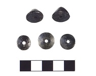 Five buttons of similar shape. Polished surface with vertical scratches. Conical shape, flat bottom. Pierced through center. Rounded edges.
