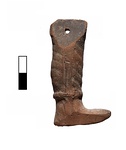 | Description: | A complete leg from knee down, wearing a boot. The top is pierced, just above the knee, for attaching to the figure. Reddish brown slip. No paint. Red clay. ADDENDA: A leg of a dancing barbarian figurine. | |
