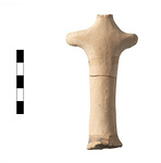 | Description: | Woman with extended arms. Head and arms broken off; back of base chipped. Glaze bands around base, body below arms, across shoulders in front and around neck; coarse diagonal glaze strokes on chest; Dull black glaze. Pale buff clay with grits. | |